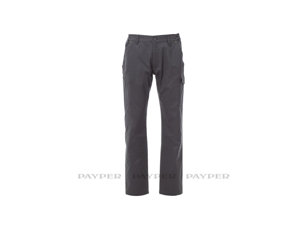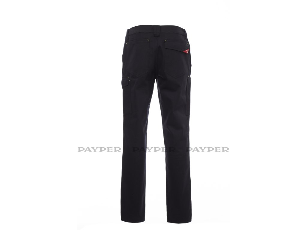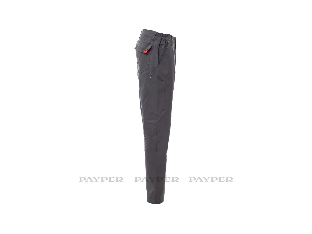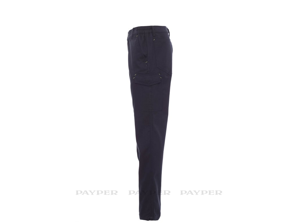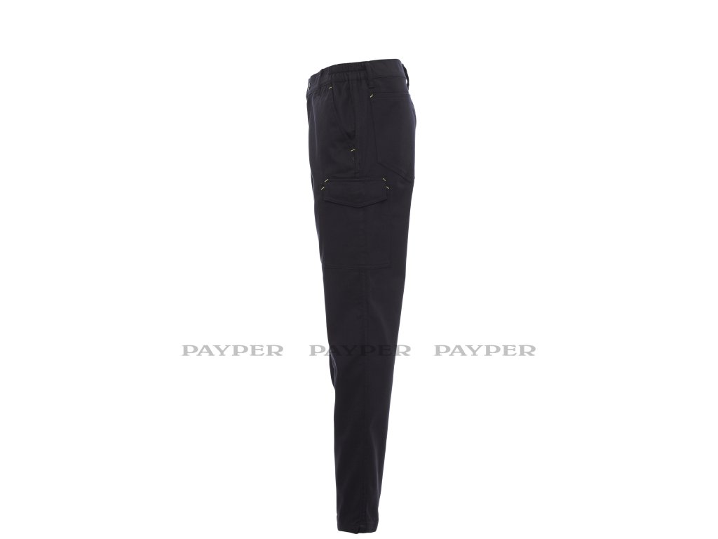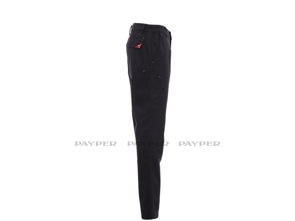 Kalhoty s poutky a elastickým páskem v pase, zapínání na zip a knoflík. Dvě přední kapsy klasického střihu, kapsička na mince, pravá postranní kapsa na svinovací metr, levá postranní kapsa s uzavírací klopou LOCK SYSTEM, dvě zadní kapsy, z nichž jedna s klopou na suchý zip. Prošití trojjehlou.