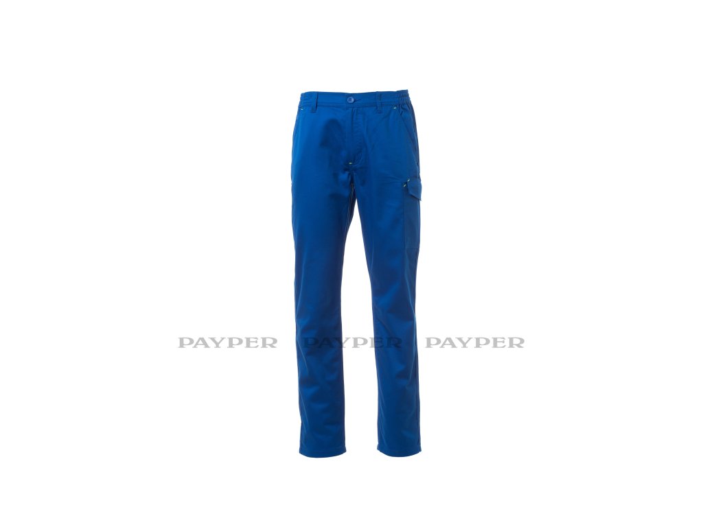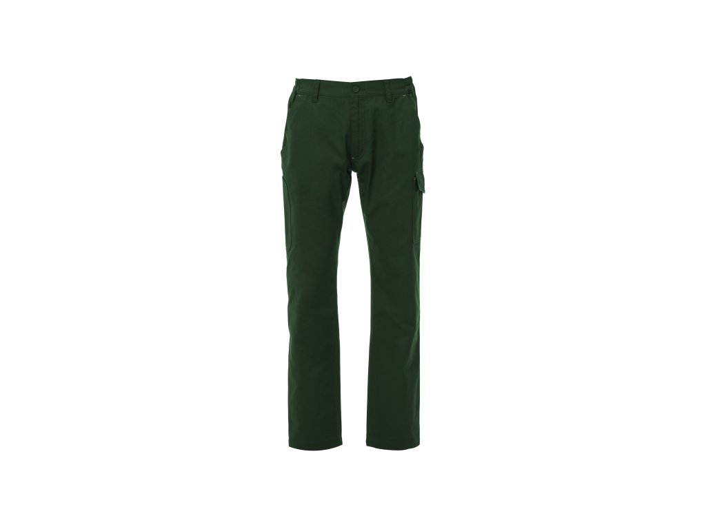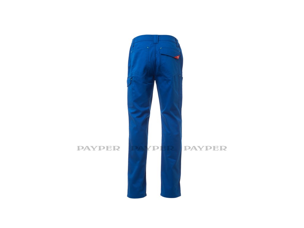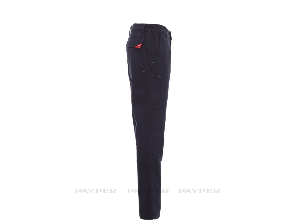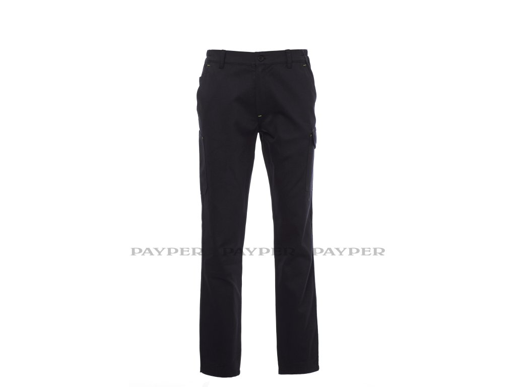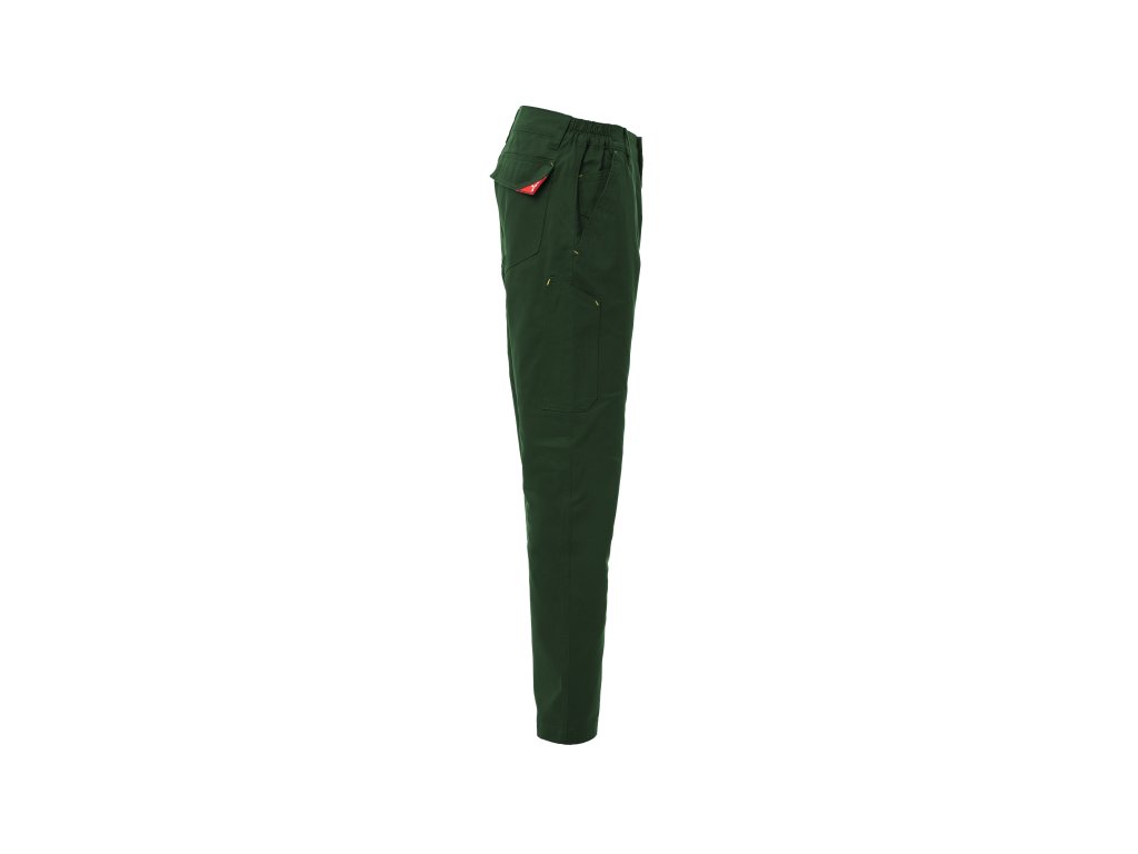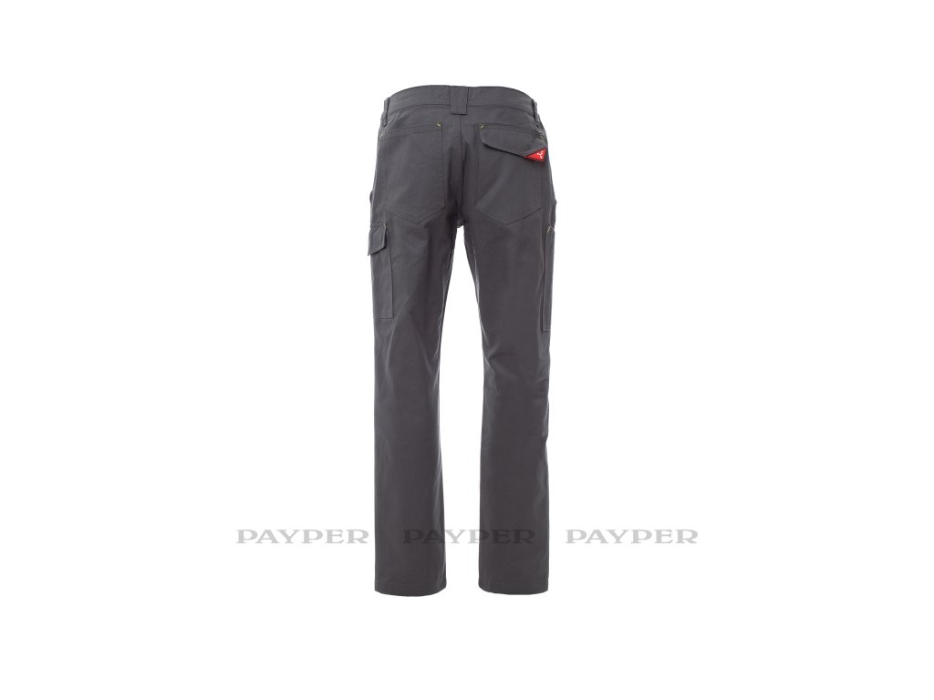 Kalhoty s poutky a elastickým páskem v pase, zapínání na zip a knoflík. Dvě přední kapsy klasického střihu, kapsička na mince, pravá postranní kapsa na svinovací metr, levá postranní kapsa s uzavírací klopou LOCK SYSTEM, dvě zadní kapsy, z nichž jedna s klopou na suchý zip. Prošití trojjehlou.